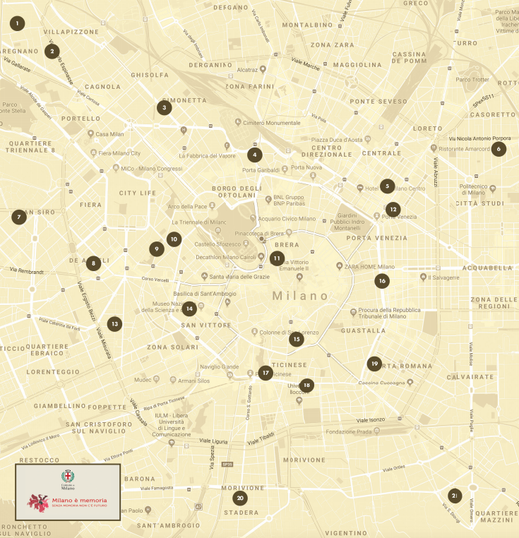 Le 28 nuove pietre d’inciampo vengono posate in 21 diverse vie della città, in corrispondenza del luogo in cui si trovavano le abitazioni delle persone a cui sono dedicate. In particolare, ricordano Davide Pedretti, in via Barnaba Oriani 54 Oreste Giudici, in via Salvator Rosa 13 Giovanni Dolfi, in via Principe Eugenio,15 Costantino Codini, in via Ceresio, 3 Roberto Lepetit, in via Benedetto Marcello, 8 Eugenia Cuzzeri Caminada, in via della Sila, 27 Antonio Gentili, in via Paravia, 84. E ancora, Giorgio Goldschmiedt, Jole Camerini Goldschmiedt, in via Faruffini,13 Anna Rabinoff Schweinoster, in via Mario Pagano, 50 Gian Natale Suglia Passeri, in via Mario Pagano, 42 Giorgio Puecher Passavalli, in via Broletto, 39 Frieda Lehmann, in via Malpighi, 4 Luigi Villa, in via Romolo Gessi, 8 Andrea Schivo, in Piazza Filangieri, 2 Antonia Frigerio Conte, in via S. Eufemia,19 Corinna Corinaldi Segre, in viale Bianca Maria, 21 Romeo Garotta, in viale Gian Galeazzo, 8 Umberto Recalcati, in viale Bligny, 26 Pio Foà, Enrica Foà, Giorgio Foà, in via Carlo Botta,15 Mario Provasi, in via Palmieri, 22. E infine Bohor Nahman Varon, Sara Attias Varon, Hasdai Varon, Dora Varon, Leone Varon, in via dei Cinquecento,19.