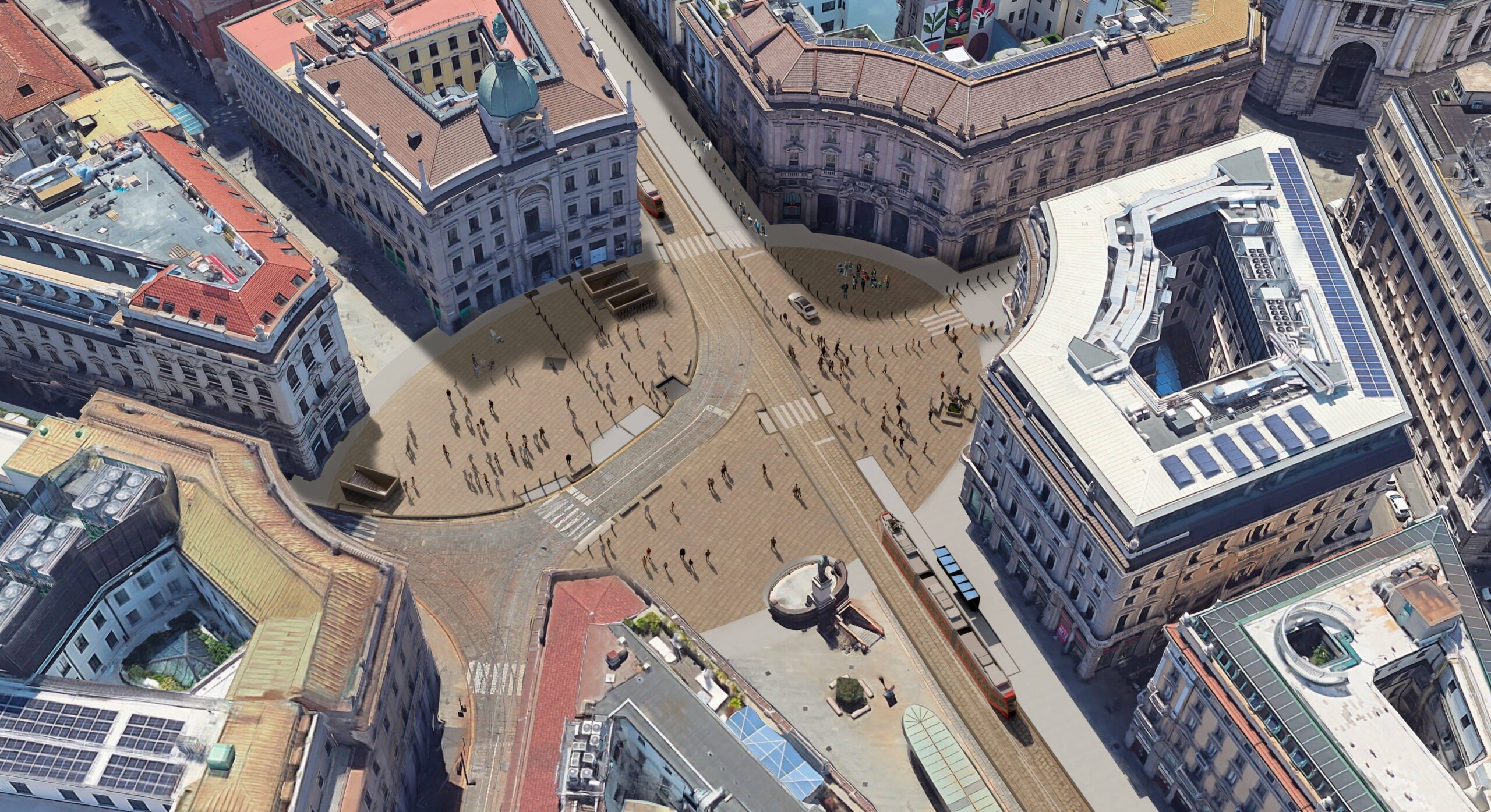 Ricomporre l’unità della piazza, con il recupero dell’ellisse originaria disegnata da Luca Beltrami, ampliarne l’uso pedonale coinvolgendo il tratto sud di via Dante, riordinare e ripulire lo spazio pubblico dagli elementi di segnaletica e di arredo incoerenti o inutilizzati. Questi gli obiettivi principali del progetto che riqualifica circa 8.700 mq di spazio pubblico insistendo su piazza Cordusio e sulle vie limitrofe, Cordusio, Orefici e l’ultimo tratto di via Dante dall’incrocio con via Meravigli verso Duomo, firmato dall’architetto Leopoldo Freyrie con Mic-Hub e Esa Engineering.