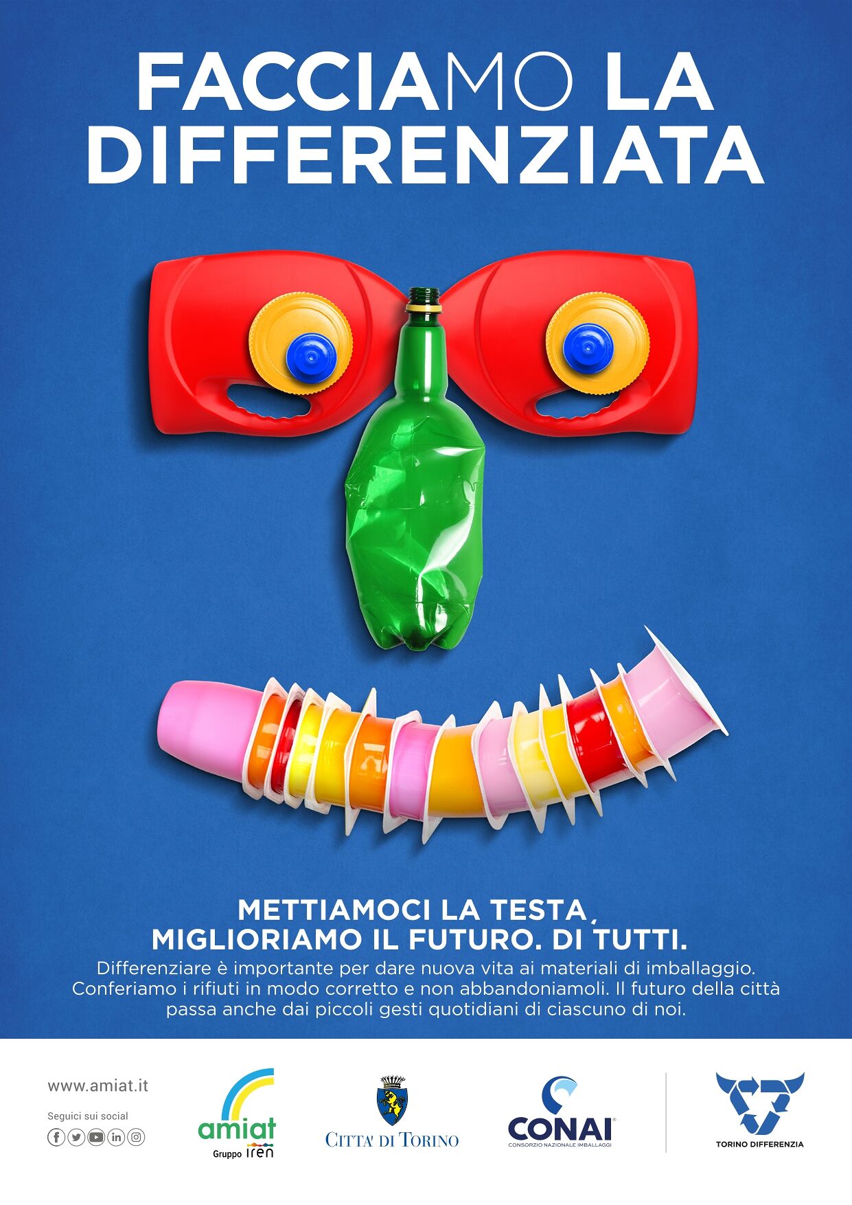 Cartoni delle uova, bottiglie di plastica e vetro, scatolette, frutta e verdura trasformati in volti sorridenti per dire ‘mettiamoci la faccia’ dando ciascuno il proprio contributo alla tutela dell’ambiente e del territorio. È la nuova campagna ‘Facciamo la differenziata‘ lanciata da Amiat Gruppo Iren, Città di Torino e Conai per sensibilizzare i cittadini al corretto smaltimento dei rifiuti.